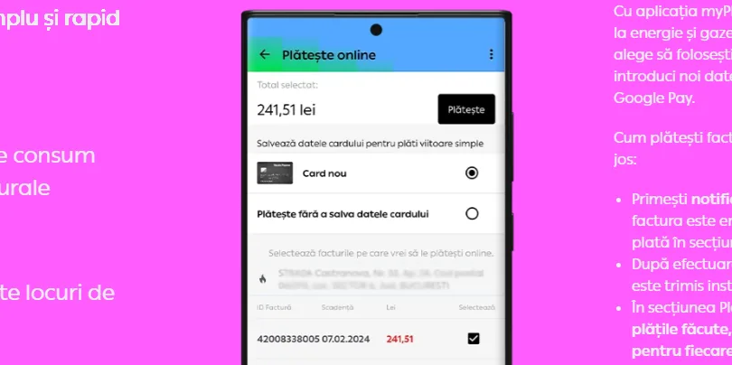 Utilizatorii beneficiaza de notificari pentru emiterea facturilor, scadente si perioadele de autocitire. Aplicatia afiseaza un grafic comparativ al consumului lunar, fiind ideala pentru controlul cheltuielilor. Totul se face rapid, direct de pe telefon, din confortul casei tale si este disponibila pentru descarcare din Huawei AppGallery, iOS si Android.